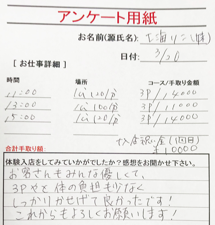 良いお客様にご指名いただいたこと、そして「しっかり稼げたこと」がアンケートからも伺えます。