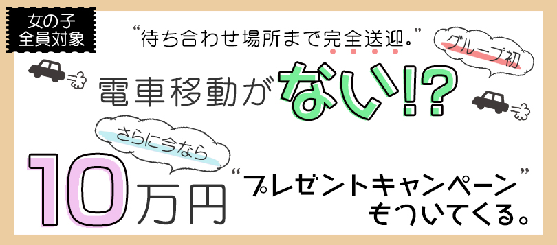今回の送迎システム導入により、この10万円プレゼントキャンペーンを気楽にチャレンジしてGETしてる体験入店の方が約8割いらっしゃいます。